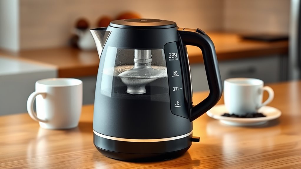 Safety features are essential considerations because they protect both users and the device during operation. Auto shutoff is a key feature that turns off the kettle once the water reaches the desired temperature, preventing overboiling and conserving energy. Many kettles also include boil-dry protection, which halts operation if the water level drops too low, safeguarding the device from damage. Safety elements like cool-touch exteriors and secure lids reduce burn risks, especially during boiling. Combining precise temperature control with auto shutoff ensures your beverages are heated safely and accurately. Certifications like UL or ETL further reassure that the kettle meets strict safety standards. Overall, these features not only enhance safety but also prolong the lifespan of your kettle.