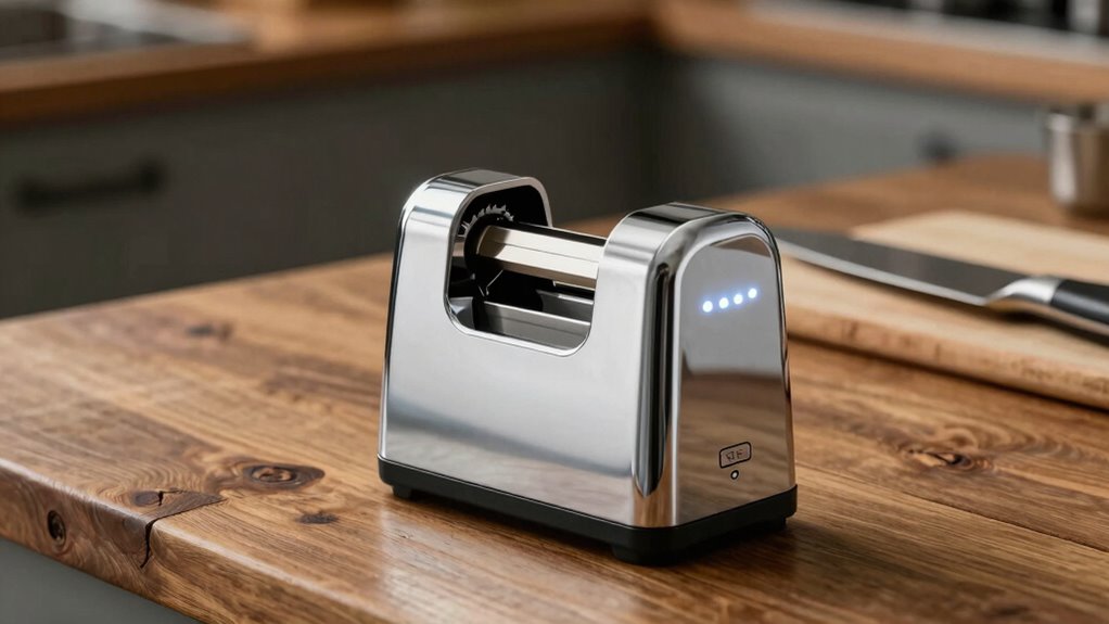 Choosing the right electric knife sharpener depends heavily on the type of sharpening system it uses, as this determines how efficiently and effectively your blades will be refined. Single-stage systems are straightforward, refining the edge in one pass—ideal for quick touch-ups. Two-stage models add a coarse stage to handle dull blades and a fine stage for finishing, making sharpening faster and more effective. Three-stage systems go further, including a polishing or stropping phase for an ultra-sharp, burr-free edge that lasts longer. The system type also influences the time required; multi-stage options tend to be more precise and durable. Some models feature advanced elements like diamond abrasives or flexible guides, ensuring consistent angles and reducing potential blade damage. Picking the right system depends on your sharpening needs and desired results.