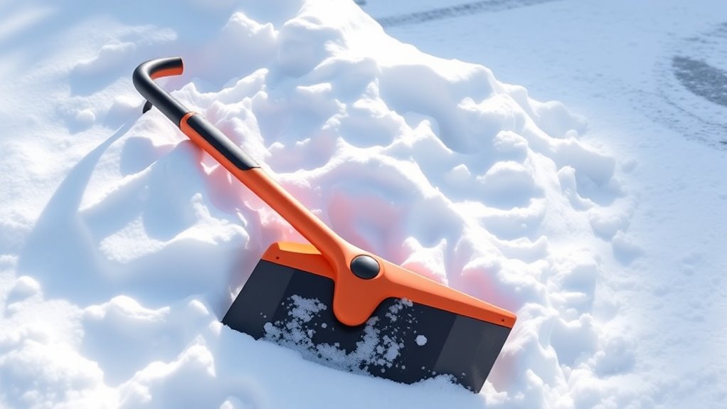 Lightweight shovels can struggle with heavy, wet snow because their design isn’t built for such tough conditions. I’ve found they work best for light, powdery snow or quick cleanup. When faced with heavy, wet snow, I prefer a more robust, heavier-duty shovel to avoid strain and guarantee effective removal. If you’re dealing with wet snow often, consider a sturdier option for easier, safer clearing.
