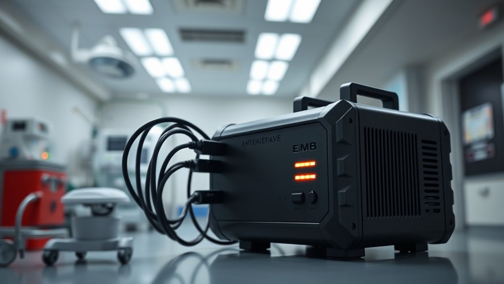 I focus on safety features that protect medical equipment from power surges and failures. My emergency power supplies include surge protectors, automatic voltage regulation, and backup batteries that kick in instantly during power outages. These features guarantee uninterrupted, stable power, reducing risks of damage or malfunction. I also incorporate alarms and automatic shutdowns to alert staff of issues, keeping your medical environment safe and reliable at all times.