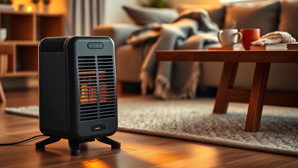 Ceramic heaters are more energy-efficient than traditional heating methods because they heat up quickly and distribute warmth evenly. I’ve noticed they use less energy while providing ample heat, making them cost-effective. Unlike furnaces or baseboard heaters, ceramic units are portable and target specific areas, saving energy. I prefer them because they warm spaces fast without wasting power, helping me stay cozy without high energy bills.