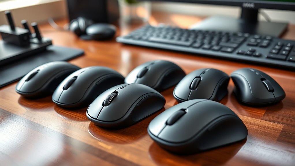 To maximize ergonomic benefits, it’s important to contemplate the connection options available on your mouse. Flexible connection modes like Bluetooth, 2.4GHz USB, and USB-C make setup easier and enhance compatibility across devices. Dual-mode mice that switch seamlessly between Bluetooth and wireless USB streamline workflow and reduce cable clutter. Compatibility with multiple operating systems—Windows, Mac, Linux, Android—ensures you can use your mouse across different devices without issues. Wireless mice supporting multiple devices let you toggle effortlessly between a computer, tablet, or smartphone, saving time and hassle. Some models include multiple receivers or adapters, accommodating devices without traditional USB ports and expanding connectivity options. Overall, choosing a mouse with versatile connection methods boosts convenience and productivity while supporting ergonomic use.