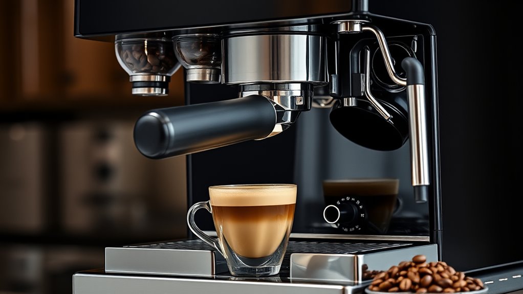 Brewing speed and efficiency play a significant role in how quickly you can enjoy your espresso, especially during busy mornings. Some machines brew in under 30 seconds, while others take up to two minutes, affecting your wait time. Quick heat-up systems, often under 30 seconds, help you start brewing faster, saving precious time. Automated shot dosing and pre-programmed settings guarantee consistent, speedy results, which is a huge plus when you’re in a rush. Features like dual boilers or rapid heating systems allow you to switch seamlessly between brewing and steaming, streamlining your workflow. Additionally, larger water reservoirs and efficient grinder-to-brew pathways minimize refilling and preparation delays. All these factors combine to make your espresso routine quicker and more efficient without sacrificing quality.