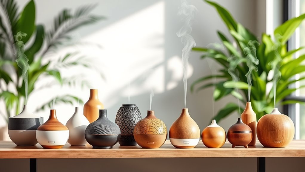 If you’re looking to transform your space with calming aromatherapy, I recommend checking out top diffusers like the ASAKUKI 500ml for larger areas, the compact InnoGear, or the stylish Himalayan salt lamp diffuser. Pair them with high-quality essential oils like eucalyptus or lavender to enhance your atmosphere. These diffusers offer features like adjustable mist, LED lights, and safety auto shut-off. Keep exploring to find the perfect diffuser that matches your style and needs.