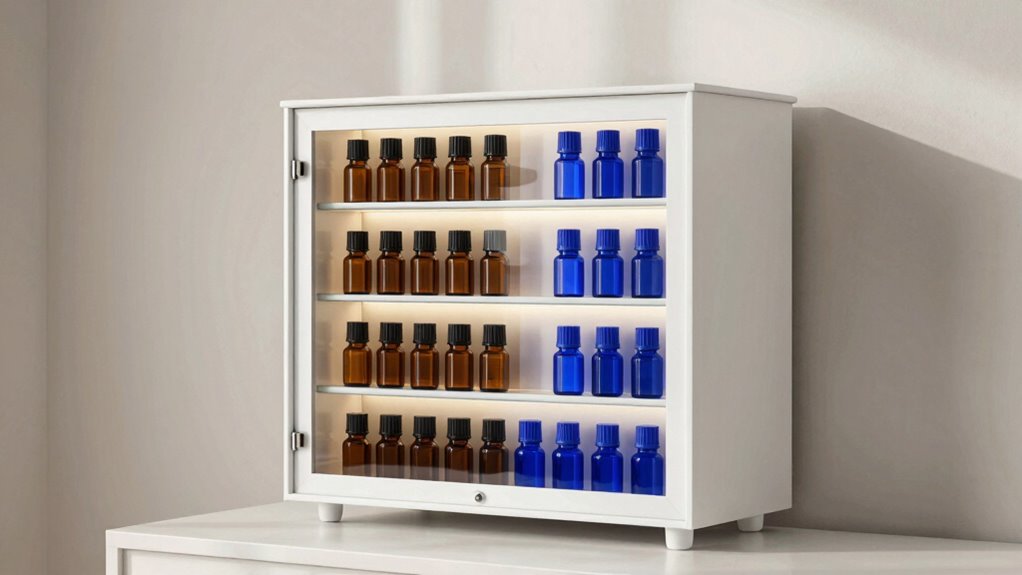 Yes, many of these cabinets act like a fortress, shielding your essential oils from harmful light exposure. They often feature tinted or opaque doors, UV-resistant glass, or built-in light-blocking layers to keep your oils’ potency intact. This means your precious oils stay fresh and effective longer. I love how these thoughtful features help preserve their quality, making sure your aromatherapy experience remains pure and powerful over time.