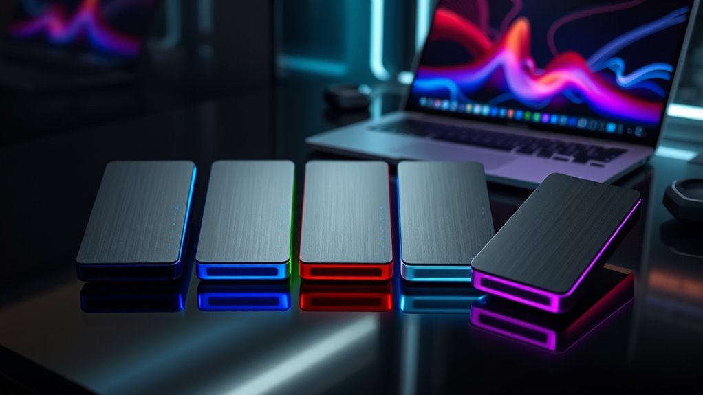 Durability and resistance are essential factors to contemplate because external SSDs often face demanding environments and accidental impacts. Look for IP ratings like IP65 or IP55, which indicate water and dust resistance for rugged conditions. Shock resistance ratings, such as drop protection from 2 meters or more, ensure your drive survives accidental falls. Rugged features like rubberized exteriors or reinforced chassis add extra toughness. Choose models constructed with resilient materials like forged aluminum or hard plastic to withstand physical impacts. Additionally, check temperature tolerances, including non-operating ranges from -20°C to 85°C, so your SSD performs reliably even in extreme conditions. Prioritizing these aspects guarantees your data stays safe, whether you’re outdoors, traveling, or working in tough environments.