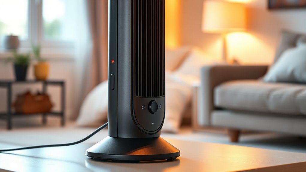 A tip-over detection system is vital for guaranteeing safety in fan heaters, especially in households with children or pets. This feature automatically shuts off the heater if it’s knocked over or tilted beyond a certain angle, reducing fire risks. Many systems use built-in sensors that detect movement or changes in orientation, triggering an immediate power cut. The sensitivity level varies; some activate at angles as low as 15 degrees, preventing accidental hazards. Regularly testing this feature is essential to guarantee it works properly and provides reliable safety. When choosing a fan heater, consider the system’s sensitivity and reliability, especially if you have active children or pets. A well-functioning tip-over detection system gives me peace of mind, knowing the heater won’t cause accidental fires or damage if tipped over.