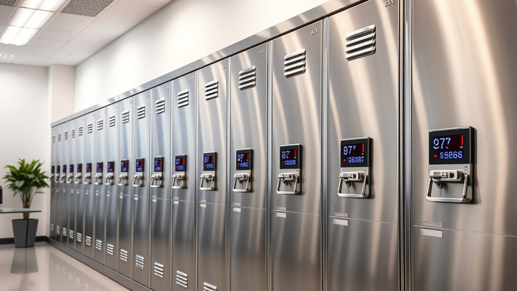 Selecting the right locking mechanism is essential to guarantee your files stay secure and accessible only to authorized individuals. Key locks are straightforward, usually coming with two keys that lock all drawers simultaneously, offering reliable security for many users. Combination locks eliminate the need for keys, requiring a code to access your documents, which reduces the risk of losing keys. Electronic locks take security a step further with keypad entry, biometric recognition, or digital access control, providing added convenience and enhanced protection. Regardless of the type, durability and reliability are vital—your lock must resist tampering, unauthorized access, and accidental openings. Carefully consider your security needs and user convenience when choosing a locking mechanism, ensuring your file cabinet provides both safety and ease of use over time.