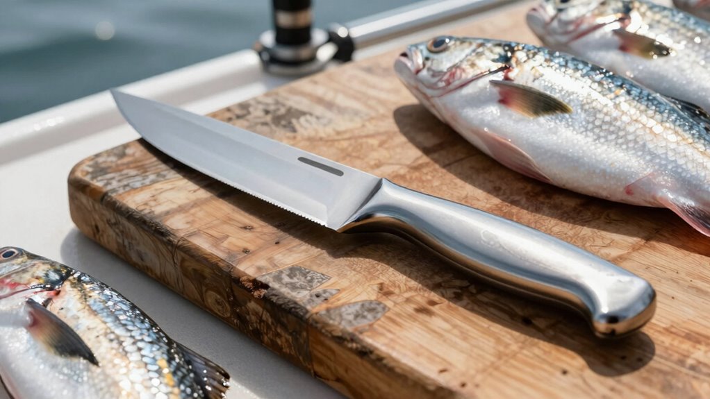 Think of saltwater and freshwater fishing as different symphonies, each demanding a distinct instrument. For saltwater, I prefer knives with rust-resistant blades like high-carbon stainless steel or titanium, which withstand the corrosive environment. For freshwater, traditional flexible blades work perfectly, offering precision without the threat of corrosion. Choosing the right knife means tuning into your specific environment, ensuring your blade plays a harmonious role in every catch.