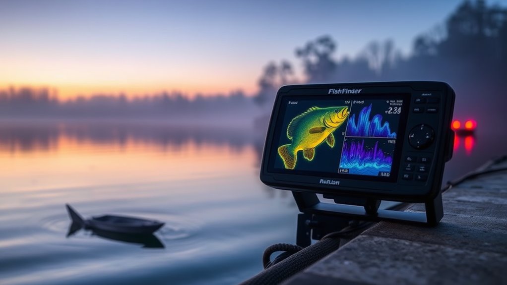 Choosing the right fish finder technology can considerably impact your fishing success, as different systems offer varied imaging capabilities and features. Traditional CHIRP sonar provides clear detection of fish and structures, while advanced options like ClearVü and SideVu give detailed images and side scans for a better underwater view. High-frequency transducers (200-400 kHz) deliver sharper images in shallow water, making it easier to identify fish and cover structures, whereas lower frequencies penetrate deeper for open water fishing. Features like AutoTuning automatically adjust settings for changing conditions, saving you time and effort. Real-time mapping tools such as Garmin Quickdraw or AutoChart Live help create detailed underwater topography, enhancing your navigation and targeting. Integration with GPS and connectivity further streamlines waypoint marking and route planning.