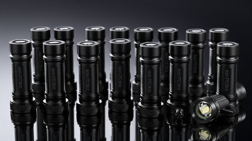 The magnetic strength of a flashlight’s base directly impacts how securely it can attach to metal surfaces during use. Stronger magnets, measured in Gauss or Tesla, guarantee a reliable grip, especially on vertical or uneven surfaces. Higher Gauss ratings mean the flashlight stays put, reducing the risk of accidental drops. The placement of the magnetic base also matters; a tail-mounted magnet often offers stability, while side-mounted options can provide easier access. The quality of the magnetic material influences durability and hold strength, preventing detachment during vigorous use. Some flashlights feature multiple magnetic points or adjustable positions, increasing versatility and ensuring you can attach the light securely in various orientations. Considering both magnetic strength and placement helps you find a flashlight that stays firmly in place when you need it most.
