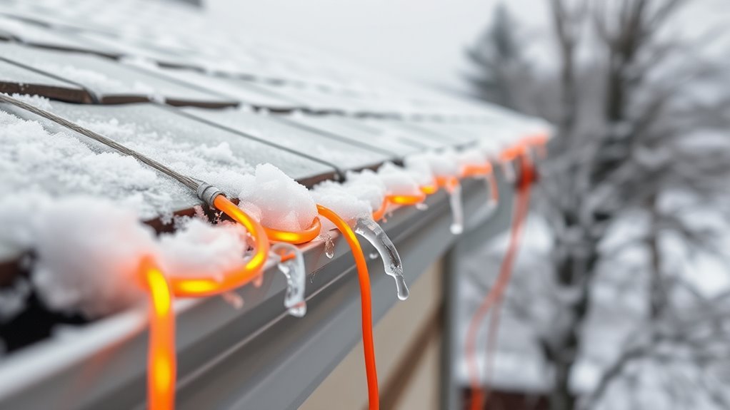 Have you considered how control features and thermostats can enhance your gutter de-icing system? These components allow the cables to automatically turn on or off based on temperature, saving energy and preventing overheating. Some cables include built-in sensors that activate only when outdoor temperatures fall below a set point, ensuring efficient operation. Adjustable thermostats give you the power to customize activation temperatures, usually between 32°F and 50°F, so you can optimize performance for your climate. Control features also help prevent unnecessary power consumption by shutting off cables during milder conditions, which extends their lifespan. Advanced options like timers, remote controls, or manual switches provide added convenience and precise control over de-icing, making your system more effective and energy-efficient.