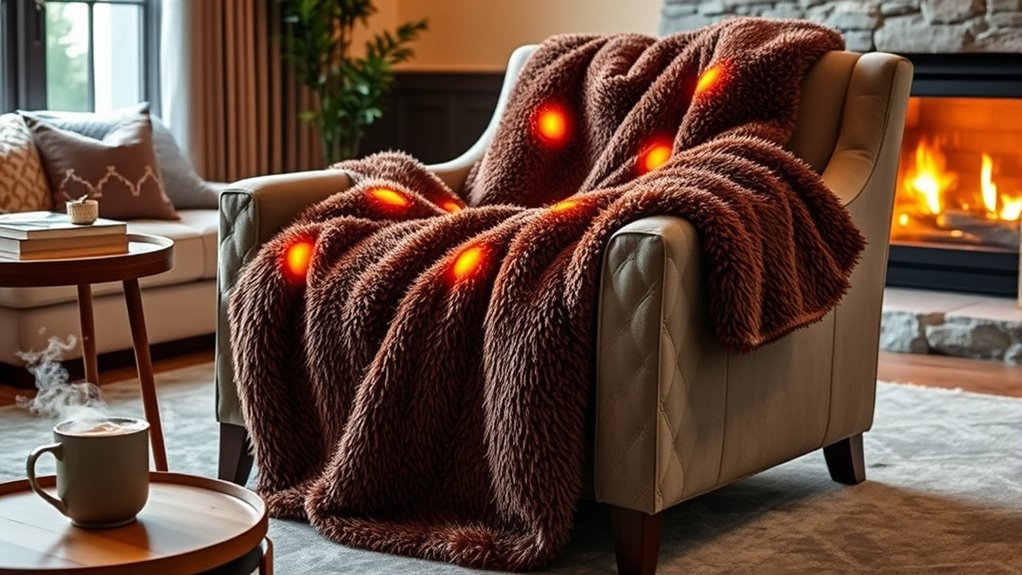 Looking for the best heated throw blankets for cozy comfort in 2025? I’ve found top options with adjustable heat levels, fast and even heating, and safety features like auto shut-off. Many are made from soft, hypoallergenic materials like plush fur, fleece, or flannel, perfect for relaxing on couches or beds. They range in size, style, and features, so you’ll find one to suit your needs. Keep going to discover the top picks and what makes them stand out.