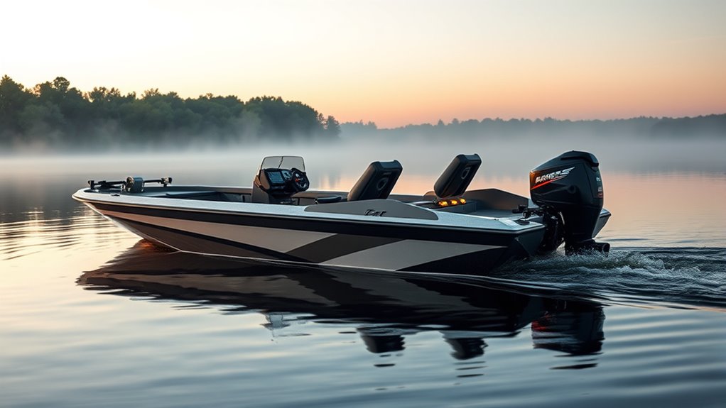 A bait boat’s range and battery life are essential factors that directly impact its effectiveness and convenience during long fishing sessions. A longer remote control range, over 500 yards, allows me to place bait precisely in large areas without moving the boat frequently. Extended battery life, supporting at least four hours of continuous operation, ensures I can run multiple baiting sessions without interruption. Dual battery systems with quick swap capabilities help minimize downtime, especially on long outings. Low battery alarms provide real-time alerts, so I avoid sudden power loss during critical moments. High-capacity, heavy-duty batteries are a must-have to maintain consistent power in demanding conditions. Overall, these features ensure my bait boat is reliable, efficient, and ready for extended fishing adventures.