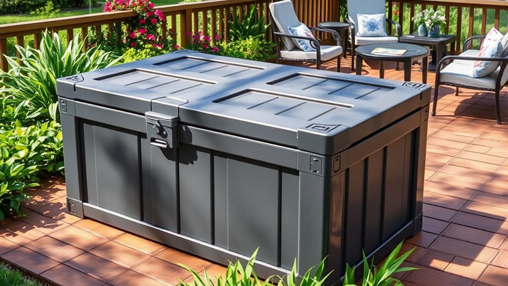 Multi-functionality is a key feature to contemplate when selecting a heavy-duty outdoor storage deck box, as it can markedly enhance your outdoor space. Many of these boxes aren’t just for storing gear—they also serve as extra seating, tables, or footrests. Some models support weight capacities that comfortably hold two or more people, which is perfect for social gatherings. Features like hydraulic piston lids allow quiet, easy access and prevent slamming, adding convenience and safety. Security is also vital; lockable lids protect valuables from theft and weather damage. By choosing a deck box that doubles as a bench or table, you maximize utility while reducing the need for separate furniture. This multifunctionality transforms your outdoor area into a more versatile and inviting space.
