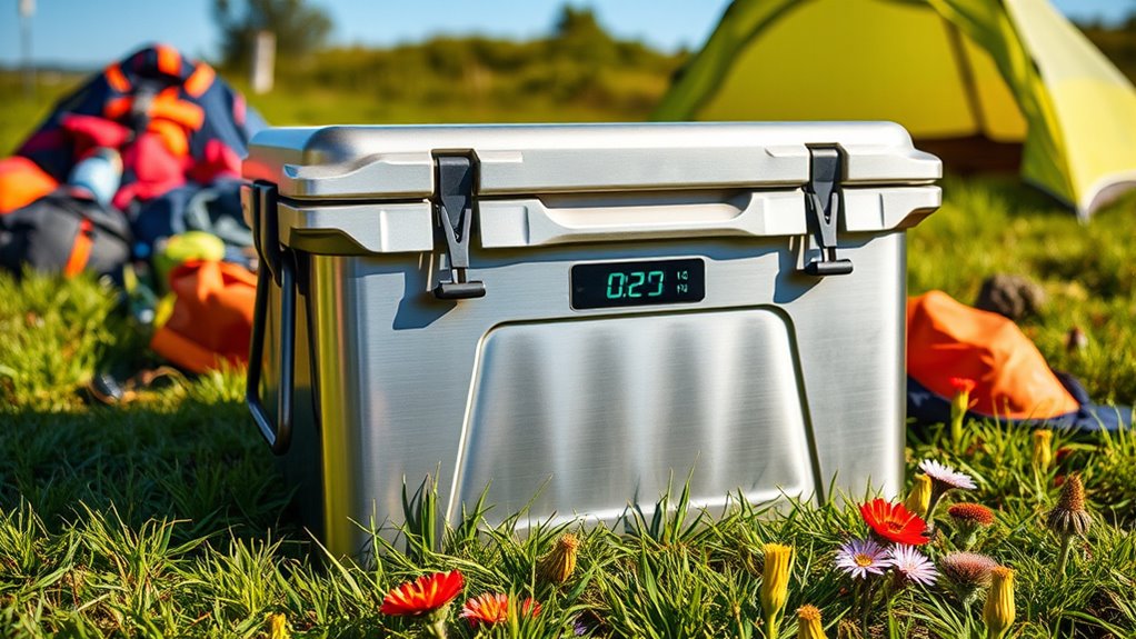 Effective insulation is essential when choosing a high-end camping cooler because it directly impacts how long your ice stays frozen and your food remains fresh. High-quality coolers often keep ice frozen for 3 to 7 days, with some models reaching up to 9 days under ideal conditions. The insulation’s quality and thickness, such as polyurethane or closed-cell foam, are critical in maintaining low temperatures over time. Features like Cool Riser Technology and radiant heat barriers help by elevating the cooler and reducing heat transfer from hot surfaces. Proper sealing with rubber gaskets or latches minimizes cold air escape, extending ice retention. Keep in mind that external factors like ambient temperature, how often you open the cooler, and load size also influence insulation performance and cooling duration.