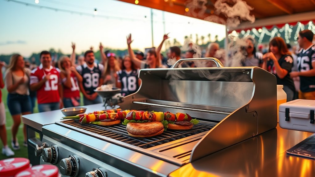 Choosing a grill that’s easy to set up and maintain can make your tailgating experience much more enjoyable. Many high-end models feature quick, tool-free assembly, so you can get grilling in minutes without hassle. After the game, cleanup is just as simple, with removable, dishwasher-safe parts and easy-to-clean grease trays that save time and effort. Durable construction with rust-resistant materials and sturdy legs ensures stability and longevity, even with frequent outdoor use. Integrated thermometers and precise heat controls help you maintain perfect cooking temperatures with minimal adjustments. Plus, portable designs with folding, locking, or wheeled features make transport and storage effortless, so you can take your grill anywhere without stress. These thoughtful features truly elevate your game day experience.
