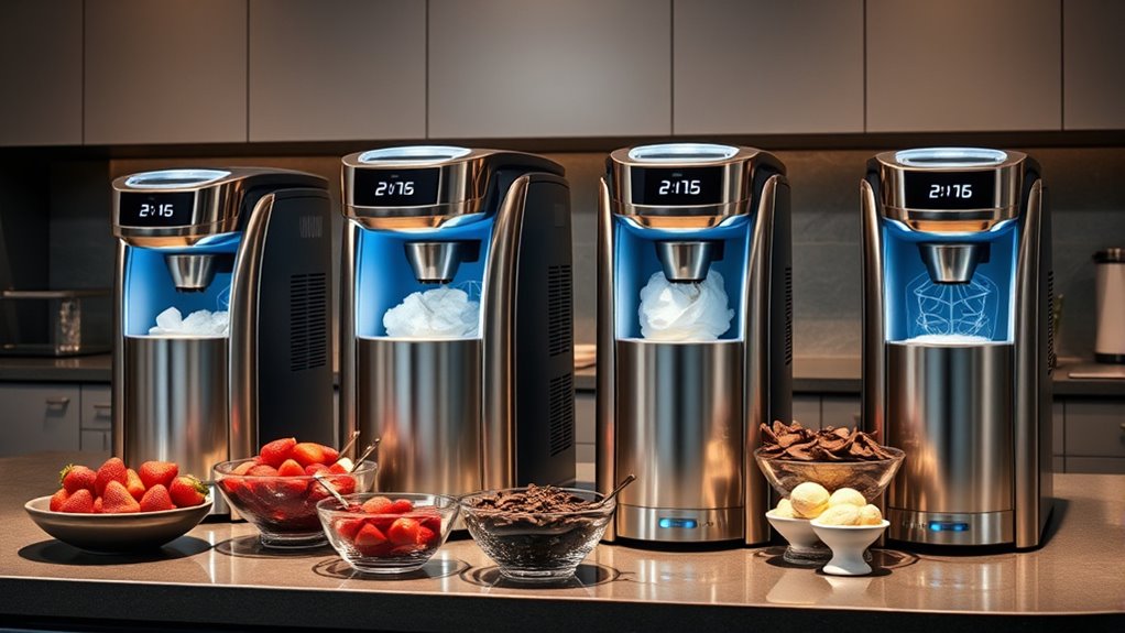 High-end ice cream makers stand out mainly because of their advanced freezing technology, which directly impacts the quality and convenience of making ice cream at home. Many models feature built-in compressors, allowing on-demand freezing without pre-freezing bowls, saving time and effort. These machines can freeze ingredients about 80% faster than traditional models, often under 30 minutes, ensuring quick results. Self-freezing systems enable continuous operation, letting you make multiple batches without pre-freezing or extra equipment. Extended cooling functions help maintain ideal freezing temperatures longer, preventing melting and preserving texture. Precise temperature control and rapid freezing capabilities are essential for achieving smooth, firm, and crystal-free ice cream, providing professional-quality results right in your kitchen.