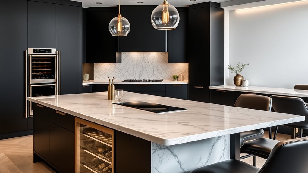 Choosing a kitchen island that matches your overall decor can transform the space into a cohesive and stylish environment. I recommend selecting materials like marble, sintered stone, or high-quality engineered wood, which add a luxurious touch and elevate visual appeal. Design details such as moldings, fluted panels, or sleek finishes can turn your island into a focal point and enhance the room’s elegance. Color coordination is key—neutral tones like white, black, or natural wood finishes provide versatility and harmony with existing cabinets and countertops. To boost style and ambiance, consider built-in features like LED lighting or decorative hardware. When these elements are thoughtfully combined, your kitchen achieves a high-end look that’s both beautiful and cohesive.