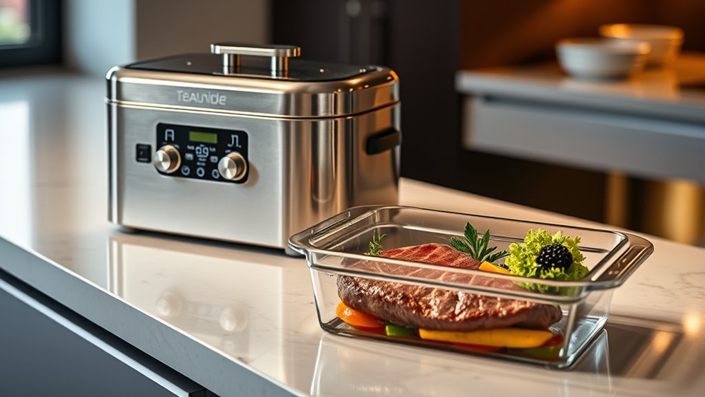 Did you know that stainless steel is used in over 80% of professional kitchens for its durability? I recommend stainless steel or BPA-free polycarbonate for sous-vide containers. Stainless steel is incredibly tough, resists corrosion, and is easy to clean. Polycarbonate offers lightweight convenience and impact resistance. Both materials guarantee your container lasts long, maintains temperature stability, and keeps your sous-vide cooking consistently perfect.