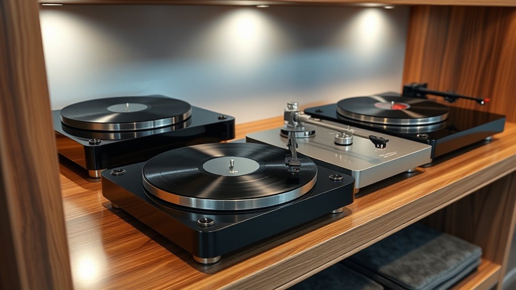 High-end vinyl record players stand out because they offer exceptional build quality, precise tonearms, and better, more stable platters. I notice their superior sound clarity, richer bass, and detailed highs compared to budget models. They also feature high-quality cartridges and customizable settings, giving me control over my listening experience. Overall, their craftsmanship and attention to detail create a more immersive, satisfying listening experience that budget models just can’t match.