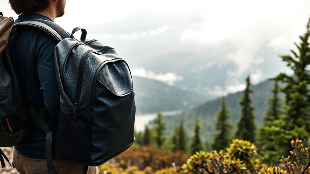 Selecting the right water-resistant hiking backpack involves more than just safety features; it also depends on how well it fits your needs regarding size and versatility. I look for a pack that can comfortably hold all my essentials for different activities, whether day hikes or multi-day trips. A compact, lightweight design is preferable for easy carrying and packing into larger luggage or pockets, especially when traveling. If I plan to fly, I ensure it meets airline carry-on size requirements. Versatility is key, so I choose a backpack with multiple compartments to keep gear organized for various outdoor scenarios. Ultimately, I select a size and capacity that match my typical trip length, making sure it’s practical without being bulky.