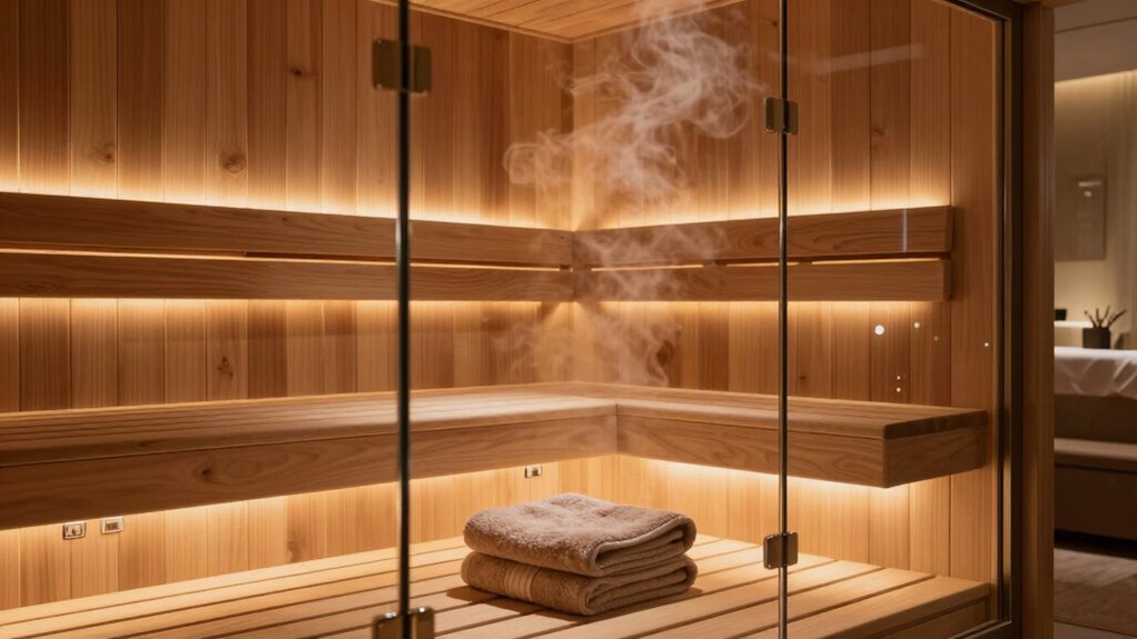 Ensuring safety features are in place is essential to making your home sauna a secure space for stress relief. Modern saunas include automatic shut-off systems that prevent overheating, reducing the risk of accidents. Tempered glass doors and panels add durability and resist shattering, enhancing safety during use. Overheat protection sensors monitor temperature levels and automatically turn off the sauna if they get too high, preventing dangerous situations. Leak-proof and explosion-proof water systems minimize water damage and steam hazards, ensuring safe operation. Additionally, safety valves and circuit breakers are crucial to prevent electrical issues that could lead to fires or shocks. These safety features provide peace of mind, allowing you to relax and enjoy your sauna without worry about potential hazards.