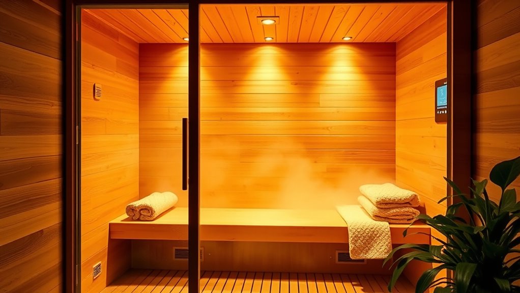 Adding wellness features to your home sauna can considerably enhance your relaxation and health benefits. Chromotherapy lighting with up to seven colors can help elevate your mood and deepen relaxation. Built-in Bluetooth speakers or audio systems let you enjoy music or guided meditations, creating a calming atmosphere. Aromatherapy features, such as integrated diffusers or dedicated compartments, allow personalized scent therapy to boost your mood and stress relief. Some saunas incorporate red or near-infrared light therapy panels, which support skin rejuvenation and cellular repair. Additionally, air quality improvements through oxygen ionizers or air purifiers can make your sauna experience healthier and more invigorating. These features not only elevate your wellness routine but also turn your sauna into a personalized oasis of relaxation and rejuvenation.