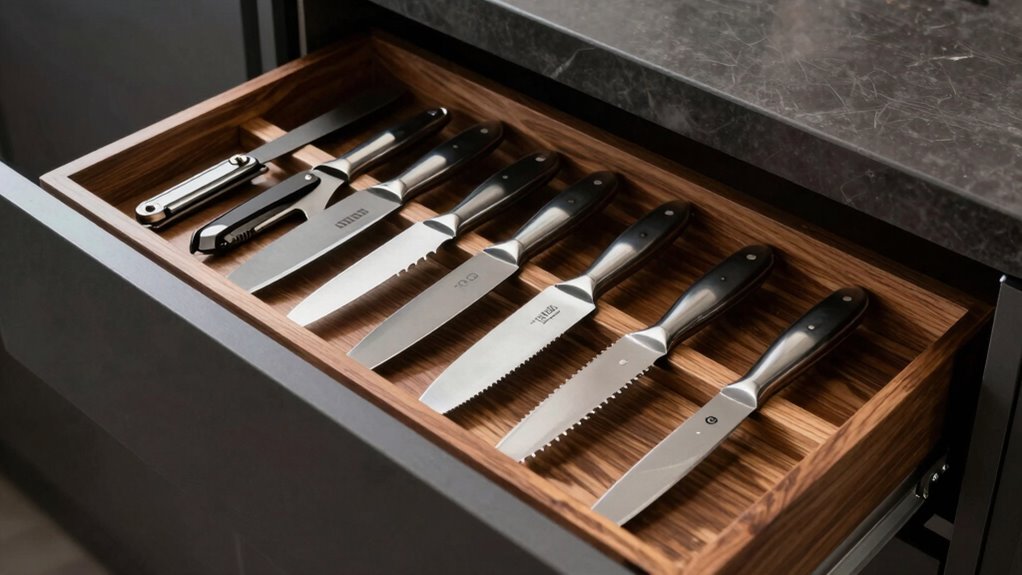 Ever wondered if these organizers fit all your knives? Yes, they’re suitable for both Western and Asian styles. I’ve found that most in-drawer knife organizers are designed with versatility in mind, accommodating different blade lengths and shapes. Just make sure to check the product specifications before buying. This way, you keep your entire collection safe, organized, and easily accessible, no matter what style of knives you prefer.