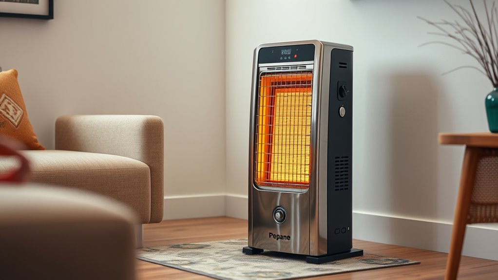 Automatic shutoff features are essential safety components to take into account when selecting an indoor propane heater with oxygen protection. These systems detect when oxygen levels fall below 18%, instantly shutting off the heater to prevent suffocation risks. The sensors are designed to respond quickly to changes, ensuring reliable safety during extended use. In addition to oxygen detection, many heaters include other safety features like tip-over switches and flame failure protection, adding extra layers of security. Proper maintenance and regular sensor calibration are paramount to keep these safety mechanisms functioning correctly over time. Choosing a heater with a dependable automatic shutoff provides peace of mind, knowing that the device will actively help prevent dangerous situations and maintain a safe indoor environment.