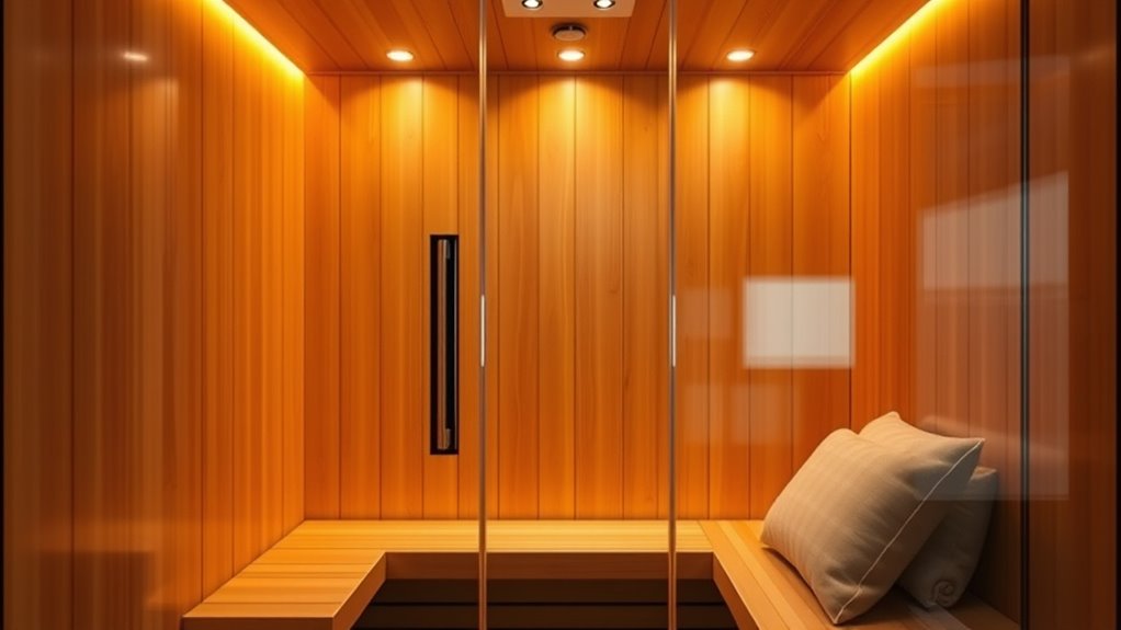 Material safety certifications are vital indicators of a sauna’s overall safety and quality. They confirm that the sauna’s components meet strict health and safety standards, reducing exposure to harmful chemicals. Certifications like UL, CE, or RoHS show that the materials used have been tested and verified for safety and compliance. Choosing certified, non-toxic, and hypoallergenic materials helps prevent skin irritation and respiratory issues during use. These certifications also ensure that harmful substances such as formaldehyde, lead, and phthalates are absent, creating a safer environment. When a sauna is backed by such certifications, I feel confident that it adheres to rigorous safety guidelines. This peace of mind is essential for enjoying a relaxing, health-promoting session without concerns about chemical exposure.