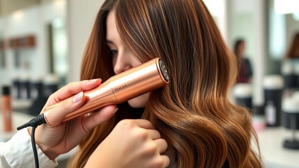 Ionic technology considerably enhances the performance of hot-air brushes by reducing static and frizz, resulting in smoother, shinier hair. The negative ions released neutralize positive ions in your hair, helping to tame flyaways and create a sleek finish. This process also closes hair cuticles, boosting shine and delivering a polished look. Ionic brushes can cut down drying time by promoting efficient moisture evaporation and even heat distribution, making styling quicker and more effective. Plus, they allow for lower heat settings, which minimizes heat damage while still achieving great volume. Consistent use of ionic tools leads to healthier, more hydrated hair, reducing breakage and improving manageability. All these factors make ionic technology a key consideration when selecting a hot-air brush for volume.