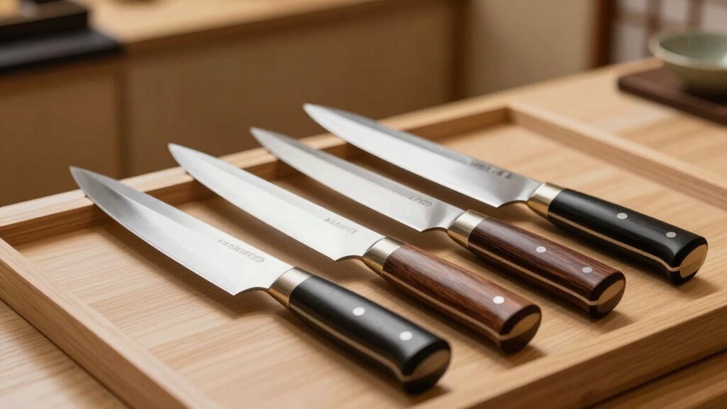 Choosing a Japanese knife starts with understanding the quality of its blade material, as this directly impacts performance and longevity. High-quality blades are typically made from premium steels like VG10, 9CR18MOV, or Damascus steel, which provide exceptional hardness and edge retention. The steel’s carbon content, usually between 0.6% and 1.0%, influences the blade’s sharpness, durability, and ease of sharpening. Proper heat treatments, such as cryogenic cooling or vacuum hardening, boost the steel’s toughness and resistance to corrosion. Multi-layer or Damascus steel blades incorporate different steels, creating beautiful patterns while enhancing durability and reducing chipping. Finally, the edge angle, often around 15°, strikes a balance between sharpness and durability, affecting cutting performance and edge longevity.