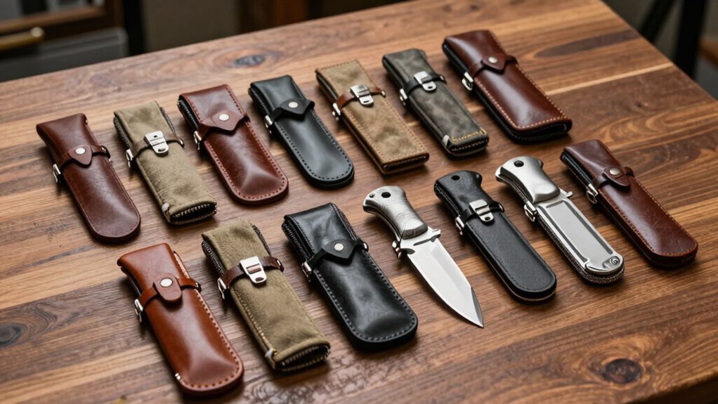 Choosing the right knife case for travel hinges on selecting durable materials that can withstand rough handling and environmental challenges. High-quality cases are often made from waxed canvas, full-grain leather, or heavy-duty nylon—materials designed to resist wear and tear. It’s *essential* that the material is cut- and puncture-resistant to protect blades from damage and prevent accidents. Water-resistant or waterproof fabrics are vitalfor keeping knives dry, avoiding corrosion caused by moisture exposure. Reinforced stitching and sturdy zippers add to the case’s structural integrity, ensuring it holds up under frequent use. Material quality directly impacts shock absorption, safeguarding blades in various travel environments. Investing in a case with durable, high-quality materials means better protection and longer-lasting performance.