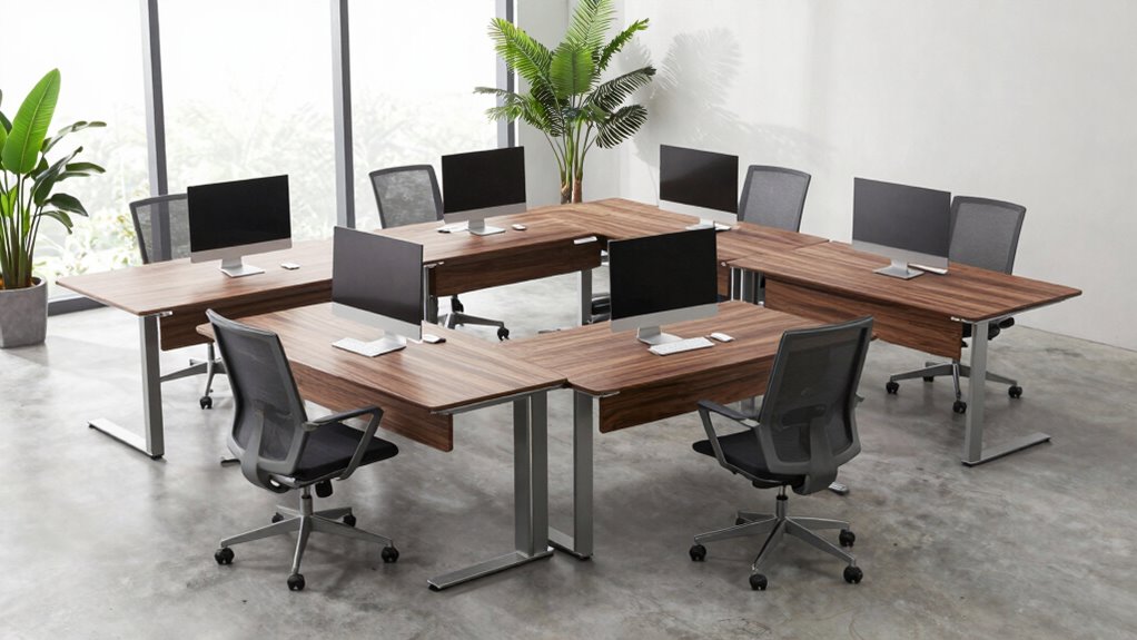 Absolutely, these desks are like a tailor-made suit for your workspace—they can be customized to fit your specific size and style needs. I’ve found that many brands offer modular options or adjustable components, making it easy to craft a setup that feels just right. Whether you need extra surface space or precise dimensions, customization options guarantee your desk seamlessly integrates into your environment, enhancing both comfort and productivity.