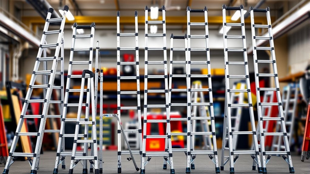 Choosing a durable and strong multi-position folding ladder starts with selecting the right materials. I recommend looking for ladders made from high-quality aluminum alloys, such as aviation-grade or industrial-grade aluminum, because they offer excellent strength and corrosion resistance. Check the material thickness—ideally 2mm or more—to guarantee the ladder can support heavy loads without bending or breaking. Reinforced joints and riveted steps also boost durability and load capacity, making the ladder safer and more reliable over time. Weather-resistant and anti-oxidation treatments are vital to prevent deterioration when exposed to the elements, maintaining strength and longevity. Finally, make sure the ladder complies with safety standards like EN131 or ANSI, which verify the ladder’s tested strength and durability for safe use.