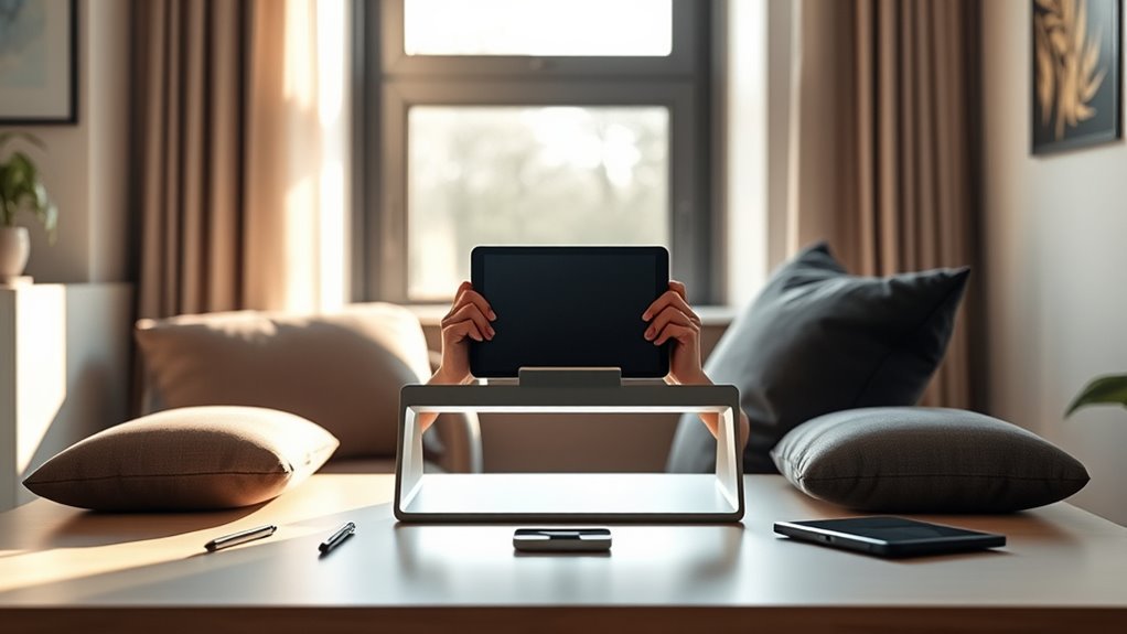 When choosing a lapstand, I look for safety features like a sturdy, non-slip base to prevent slipping or tipping. Adjustable height and angle locks are essential for stability and preventing sudden shifts. I also check for heat-resistant materials to avoid overheating, and padded edges for comfort and safety. These features give me peace of mind, ensuring my device stays secure and I stay comfortable during extended use.