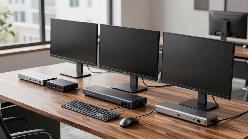 Having determined how many ports I need, I then focus on the video output capabilities of the docking station. It’s crucial to support the number of monitors I plan to use, whether dual or triple setups. I check the maximum resolution and refresh rate for each output—ideally 4K at 60Hz for crisp visuals. Compatibility is key, so I verify if the dock has HDMI, DisplayPort, VGA, or other options that match my monitors. I also consider whether it supports mirror or extended displays, depending on my workflow. Additionally, I stay aware of any limitations on resolution or refresh rates when connecting multiple screens, as some setups might be capped at 1080p in triple monitor configurations. Ensuring these features align with my needs helps optimize my workspace.