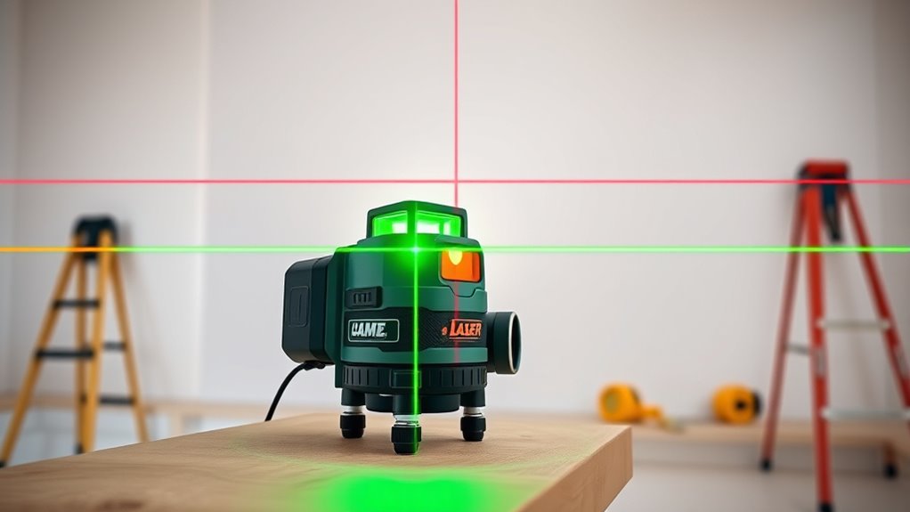 If you’re tackling DIY projects around your home, I recommend checking out a variety of laser levels designed for easy, precise work. The best models offer long-range visibility, bright green lasers, and versatile mounting options, making tasks like tiling or hanging pictures much simpler. Many come with self-leveling features and outdoor modes to handle different lighting conditions. Keep exploring, and you’ll discover the perfect laser level to boost your home improvement game.