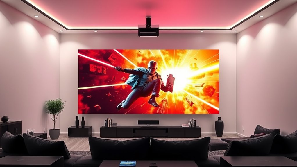 Choosing the right brightness level is essential for achieving the best image quality in your home theater laser projector. Brightness, measured in lumens, determines how vivid and clear your picture appears under different lighting conditions. For rooms with ambient light or windows, I recommend at least 3,000 to 4,000 lumens to keep images sharp and contrast-rich. In darker rooms, 1,500 to 2,500 lumens usually suffice for a bright, vibrant picture without washing out details. Keep in mind, larger screens require more lumens to maintain clarity across the entire display. However, too much brightness can cause overexposure in small, dark spaces, increasing power consumption unnecessarily. Balancing brightness with your room’s lighting and size guarantees ideal image quality and a satisfying viewing experience.