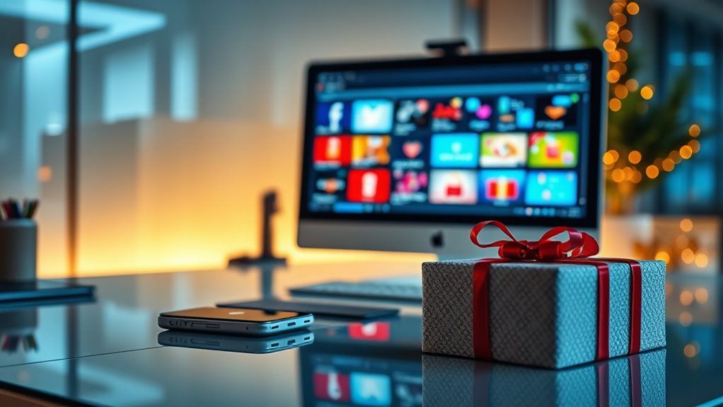 Making certain a digital gift is compatible with the recipient’s devices is essential for a smooth experience. First, check that the gift works with their smartphones, tablets, or computers, and verify the supported operating systems like iOS, Android, Windows, or Mac. This helps prevent any connection issues or limited functionality. Next, review the required apps or software to ensure they can be installed without problems. It’s also important to confirm the device’s connection types—whether WiFi, Bluetooth, or USB—match the recipient’s available ports and network setup. Finally, consider firmware or software update requirements, so the gift remains functional and secure over time. Taking these steps guarantees your last-minute digital gift will be enjoyed without technical hiccups.