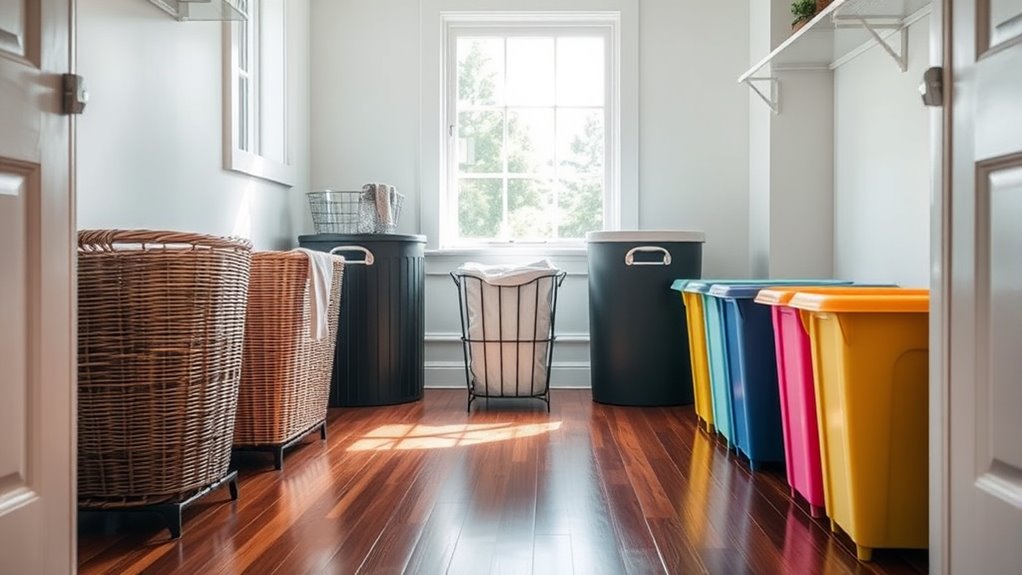 To keep your hampers in tip-top shape, I recommend following specific cleaning routines for each material. For fabric hampers, toss them in the washing machine when needed, and spot clean plastic or wicker ones with a damp cloth. Remember, a little maintenance goes a long way—if you don’t maintain, it can turn into a mountain of mess. Regular care ensures your hamper stays fresh and lasts longer.
