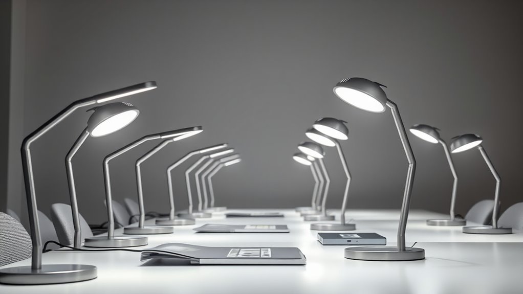 When selecting an LED desk lamp with a USB port, paying attention to its adjustable design features can make a significant difference in how well it fits your workspace. Flexible goosenecks or rotatable heads let you direct light precisely, reducing glare and shadows. Multiple brightness levels allow you to customize illumination for different tasks and ambient conditions. Variable color temperature settings, from warm to cool white, help create the right atmosphere for work or relaxation. Foldable or collapsible arms save space and make storage easy when the lamp isn’t in use. Multi-angle adjustable bases or joints provide extra flexibility, ensuring you can position the light *ideal* regardless of your setup. These features enhance functionality and comfort, making your workspace more efficient.
