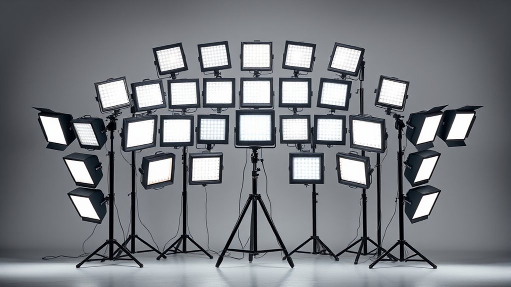 Evaluating brightness and power in LED video light panels helps guarantee your setup delivers enough illumination for professional-quality shots. Higher wattage panels generally produce more light, making them ideal for larger spaces or demanding shoots. Brightness is often measured in lumens or lux; for example, a panel outputting 15,000 lumens at 0.5 meters offers robust illumination. Adjustable brightness controls are essential, allowing you to fine-tune light intensity to suit different scenes and reduce unwanted shadows. When combined with softboxes, which diffuse intense light to soften shadows, high-powered panels can create a natural, even glow. This balance of brightness and diffusion ensures your lighting setup is versatile enough for a range of filming environments, delivering both power and soft, flattering light quality.