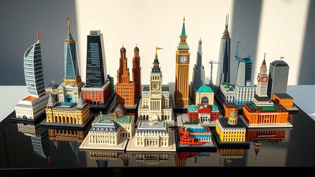 To truly appreciate the craftsmanship of LEGO Architecture kits, paying attention to visual and textural details is essential. I look for sets with intricate architectural features, decorative elements, and realistic textures that boost visual authenticity. Color schemes should mirror real-world structures, enhancing tactile realism once built. I also focus on textured surfaces, like stone-like bricks or ornate facades, which add sensory variety. The size and scale of the model matter, as larger sets often include more detailed textures that create depth and richness. Small components—such as arched windows, sculptures, or textured roofing—further elevate visual complexity and tactile appeal. These details not only make the building more realistic but also make the building process more engaging and satisfying.