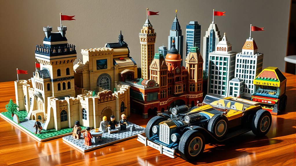 In 2025, trending themes for adult LEGO sets include intricate architectural landmarks, modern art-inspired designs, and nature scenes like lush forests and serene waterfalls. I find these themes mesmerizing because they combine creativity with a touch of sophistication. These sets challenge my skills and provide a relaxing, immersive experience. If you’re into detailed builds and stylish decor, these themes are perfect for showcasing your craftsmanship and unwinding at the same time.