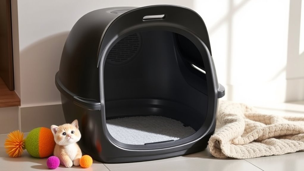 Are odor control features really indispensable when selecting a covered litter box? Absolutely. Effective odor control often depends on built-in carbon or activated charcoal filters that trap and neutralize smells. The enclosed design itself helps contain odors, preventing them from spreading through your home. However, to keep the air fresh, regular filter replacement or maintenance is vital. Choosing materials like odor-resistant plastics or stainless steel also helps manage smells over the long term. Additionally, proper ventilation—such as small holes or vents in the lid—enhances airflow and reduces odor buildup inside the box. These features work together to keep your home smelling clean and ensure your cat’s litter box remains a more pleasant space for both of you.