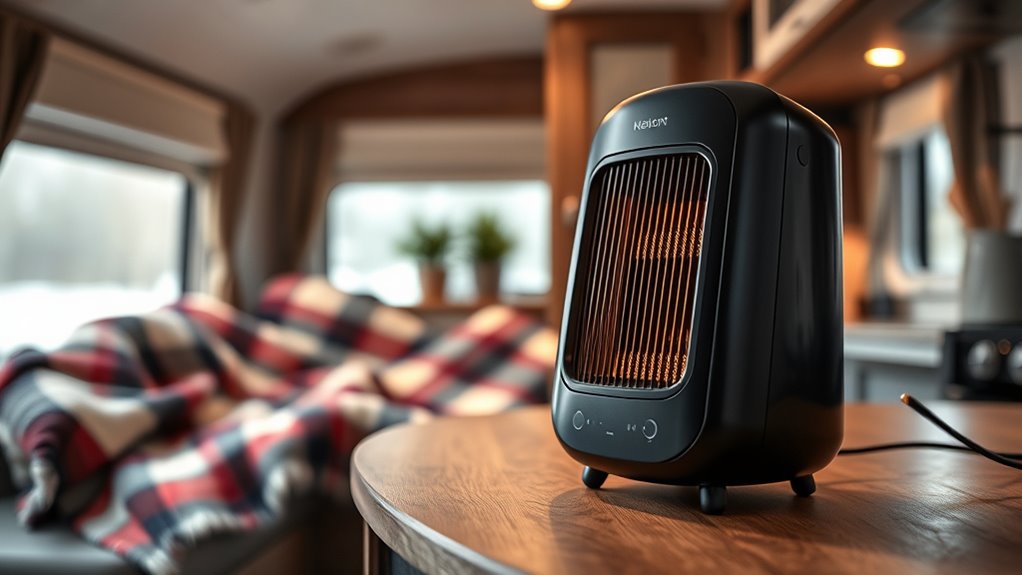 Looking for the best low-watt heaters to keep your RV warm this winter? I’ve found several space-saving models like the Caframo True North, Dreo portable heaters with thermostats and remote controls, and compact plug-in options like the Brightown 800W. These units offer safe, efficient warmth for small spaces and come with features like adjustable thermostats, tip-over protection, and modern designs. To discover which one suits your needs, keep exploring the options ahead.