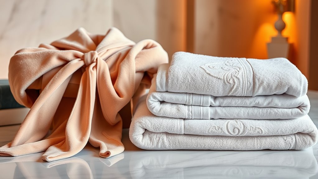 If you want to elevate your spa day, I recommend exploring some of the top luxury bathrobe and towel sets. High-quality fabrics like Turkish, Egyptian, or organic cotton provide softness and durability, while microfiber and plush fleece add extra coziness. Practical design features like deep pockets and adjustable belts make a difference, too. For a full experience, some sets include slippers and other accessories. Keep going to discover the best options to transform your relaxation routine.