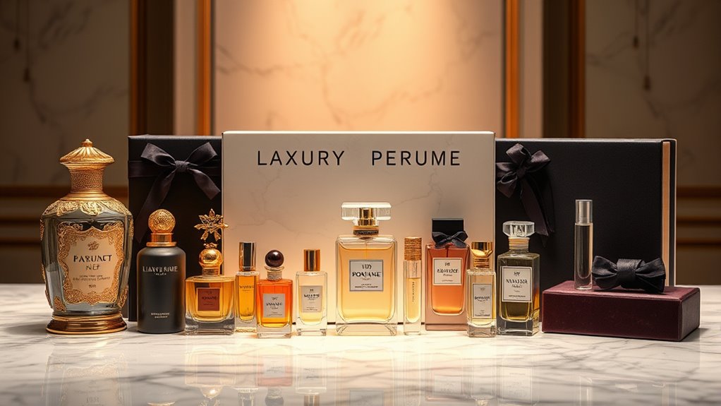 Ethical and ingredient standards are vital factors that can markedly influence the quality and integrity of a luxury perfume gift set. I look for brands that prioritize cruelty-free, vegan, and animal-testing-free formulations, reflecting my values. High-quality perfumes use premium, natural, and sustainably sourced ingredients, which not only enhance scent complexity but also guarantee longevity. Transparency in sourcing and manufacturing is imperative, as it shows a brand’s commitment to ethical practices. Certifications like cruelty-free, vegan, or organic labels are reliable indicators of responsible standards. Additionally, I avoid perfumes containing harmful chemicals such as phthalates, parabens, and sulfates, safeguarding both skin safety and environmental care. Ultimately, choosing a gift set that meets these standards guarantees a luxurious, ethical, and safe experience.